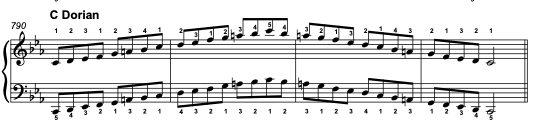 Dorian: C (W) D (h) Eb (W) F (W) G (W) A (h) Bb (W) c